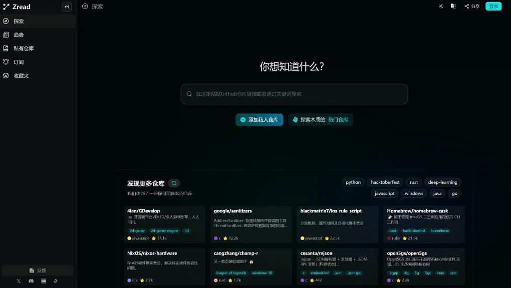 智谱AI近期推出了一款名为Zread的GitHub项目阅读神器,在码农圈里小火了一把!Zread本质上是一款 GitHub 项目解读神器,依托智谱 GLM – 4.5 核心技术,能一站式将复杂的 GitHub 仓库转化为结构清晰、易于理解的文档,核心就是通过结构化代码分析与深度知识萃取,一键生成清晰易懂的GitHub项目中文文档。
