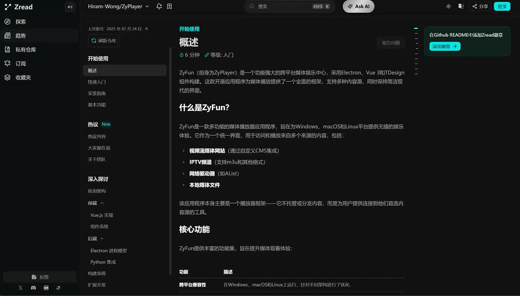 🎖️ 仓库徽章添加:可在项目 README 中添加 “Ask Zread” 徽章,点击进入当前仓库 AI 解读页面,减少重复问题,助力贡献者上手,提升 README 实用性。
