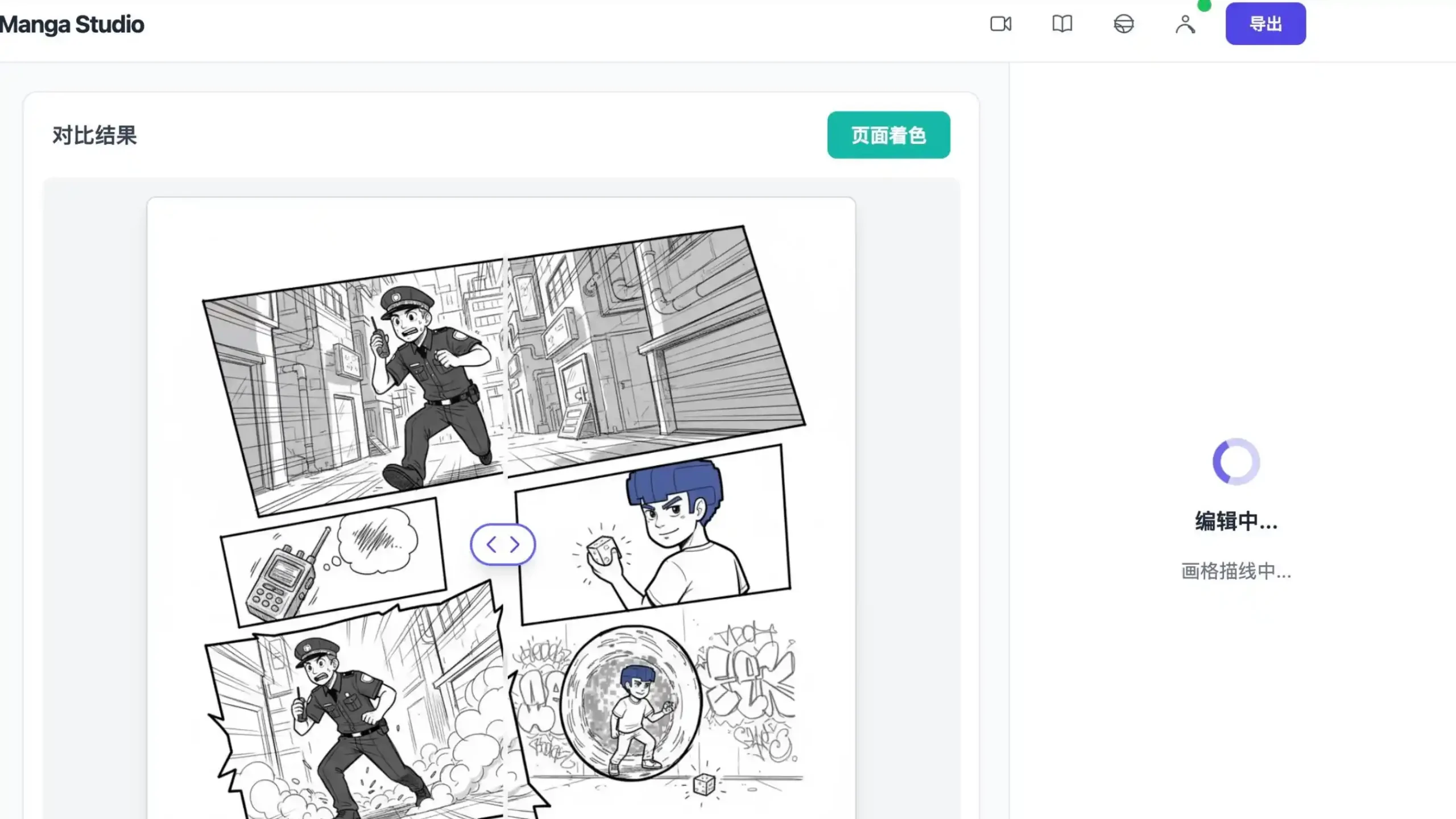 草图、线稿、上色、气泡、导出 PDF 全程浏览器完成,单人即团队。