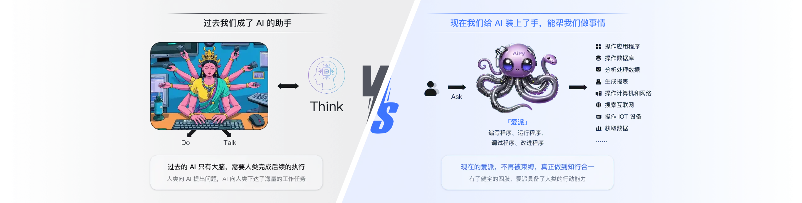 就像是给AI装上双手,能够根据用户需求自动生成 Python 代码,并执行程序以操作本地应用、数据库、物联网设备,自行制造完成任务需要的“工具”,并debug与执行、反馈