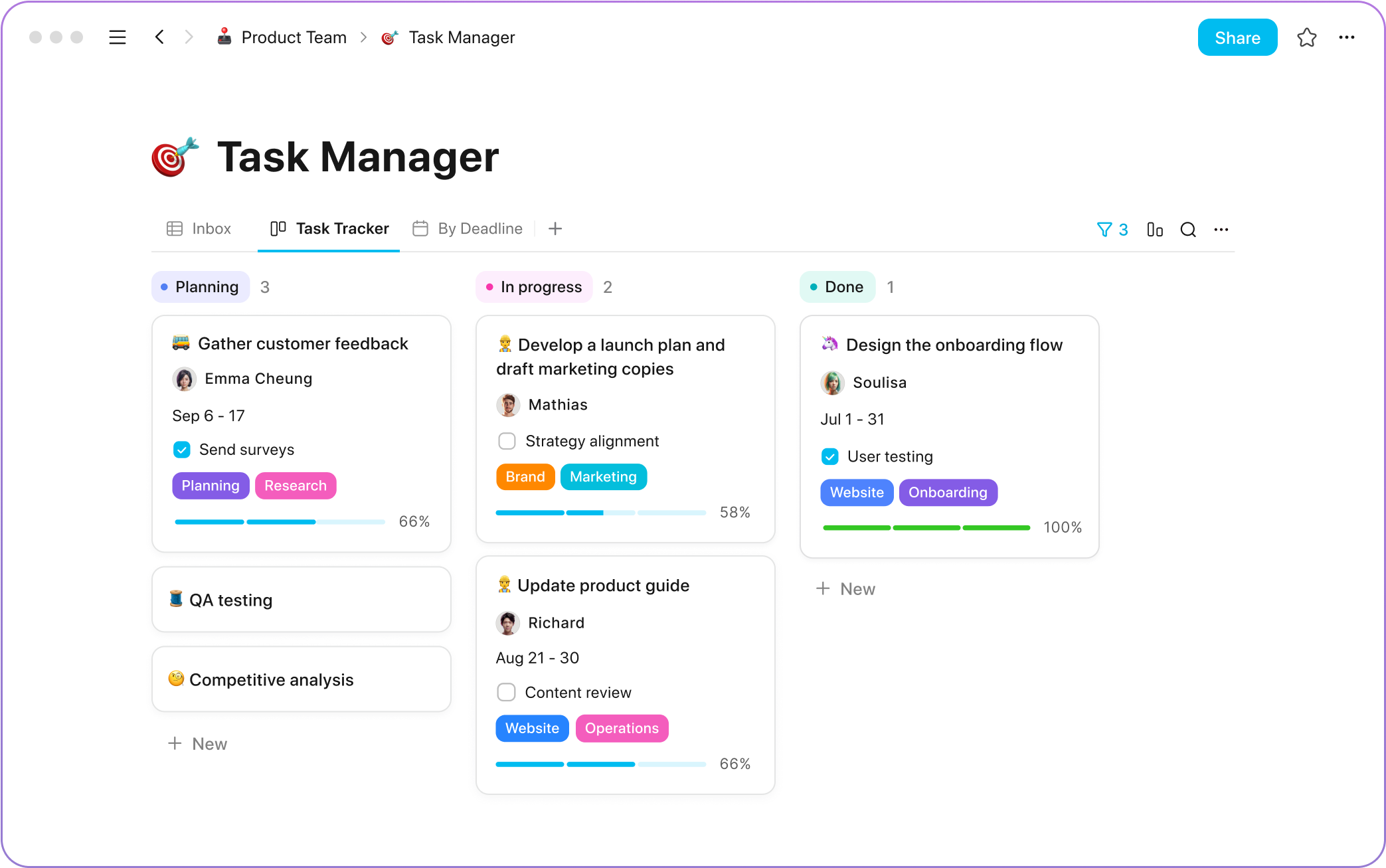 2. 灵活可定制的工作流 🔄:多种视图和工具,如任务板、待办事项、文档笔记。