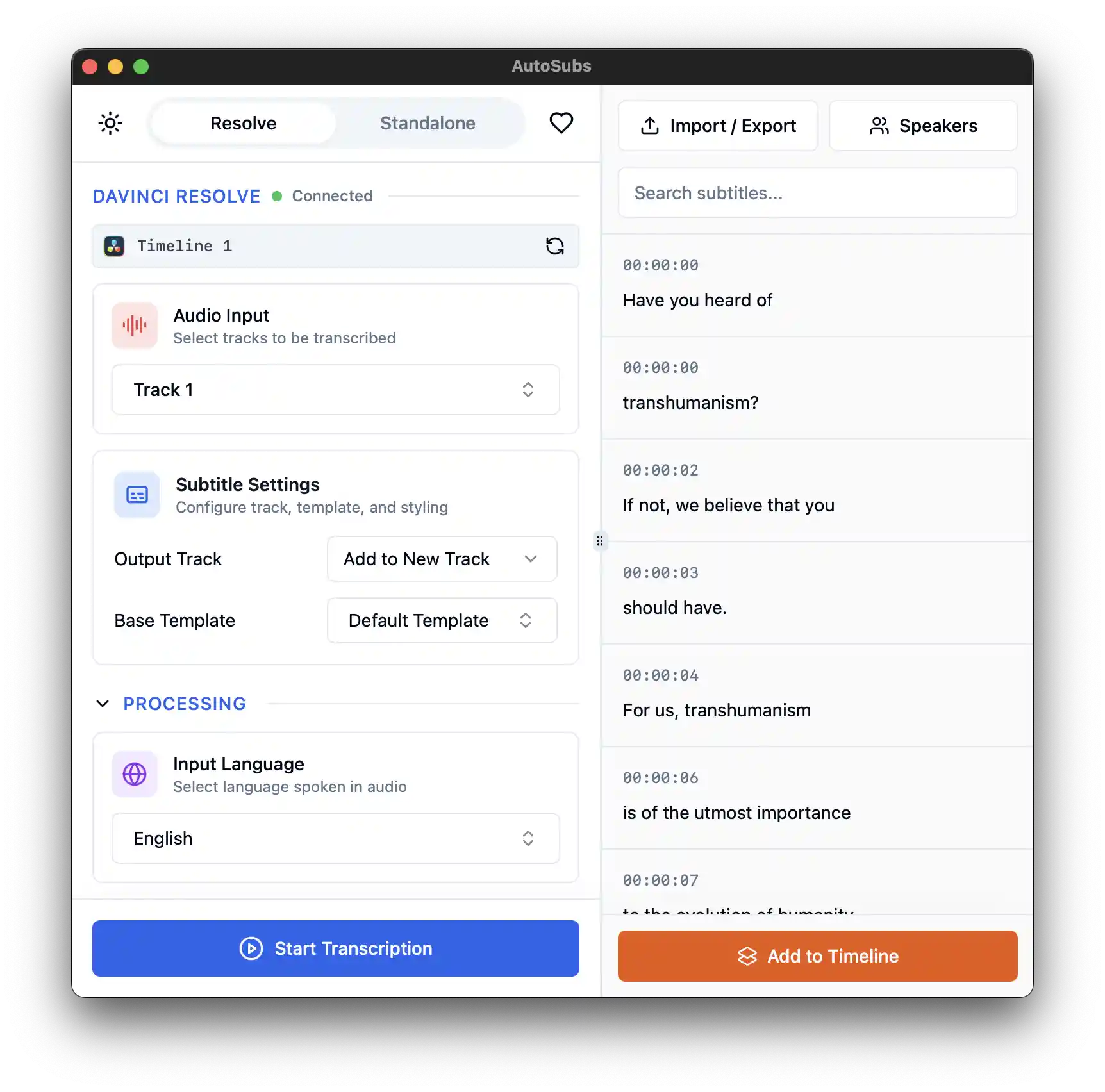 深度集成:可与专业视频剪辑软件 DaVinci Resolve 集成,实现无缝的字幕创建工作流。