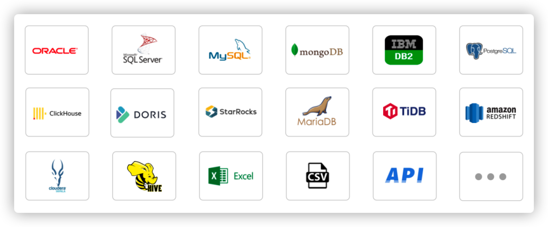 支持 Oracle、SQL Server、MySQL、Excel、API 接口等多种主流数据库,满足大多数用户的数据分析需求。