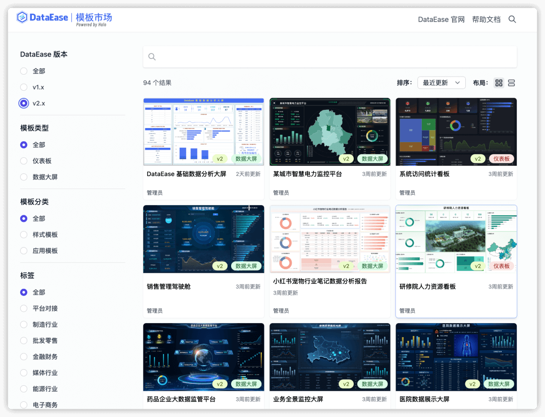DataEase 提供丰富的模板市场,涵盖多个使用场景和行业领域,一键切换到自己的数据集,快速生成各种酷炫的可视化大屏。模版地址:[DataEase Templates](https://templates.dataease.cn/)