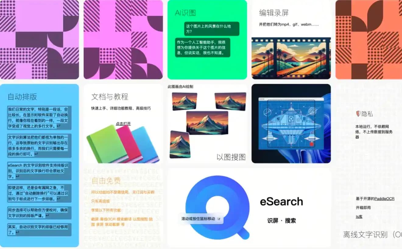 eSearch ,一款开源的瑞士军刀,集成截屏、离线OCR、搜索翻译、以图搜图、贴图、录屏、万向滚动截屏、屏幕翻译等功能于一身的工具。