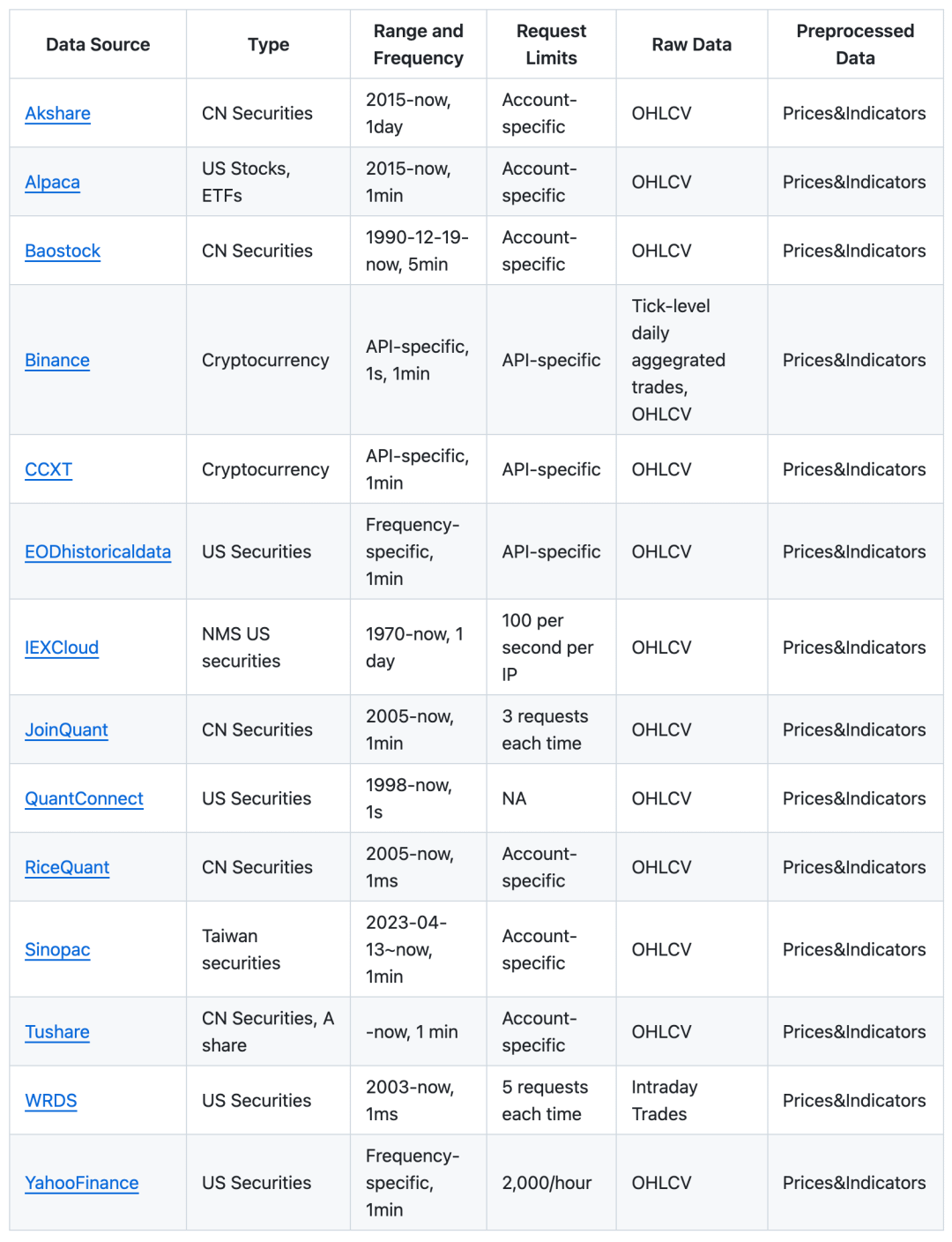 FinRL 支持多种数据源如 Akshare、Alpaca、Binance 等,同时提供了包括股票交易、加密货币交易、期权交易等多种交易任务的案例。