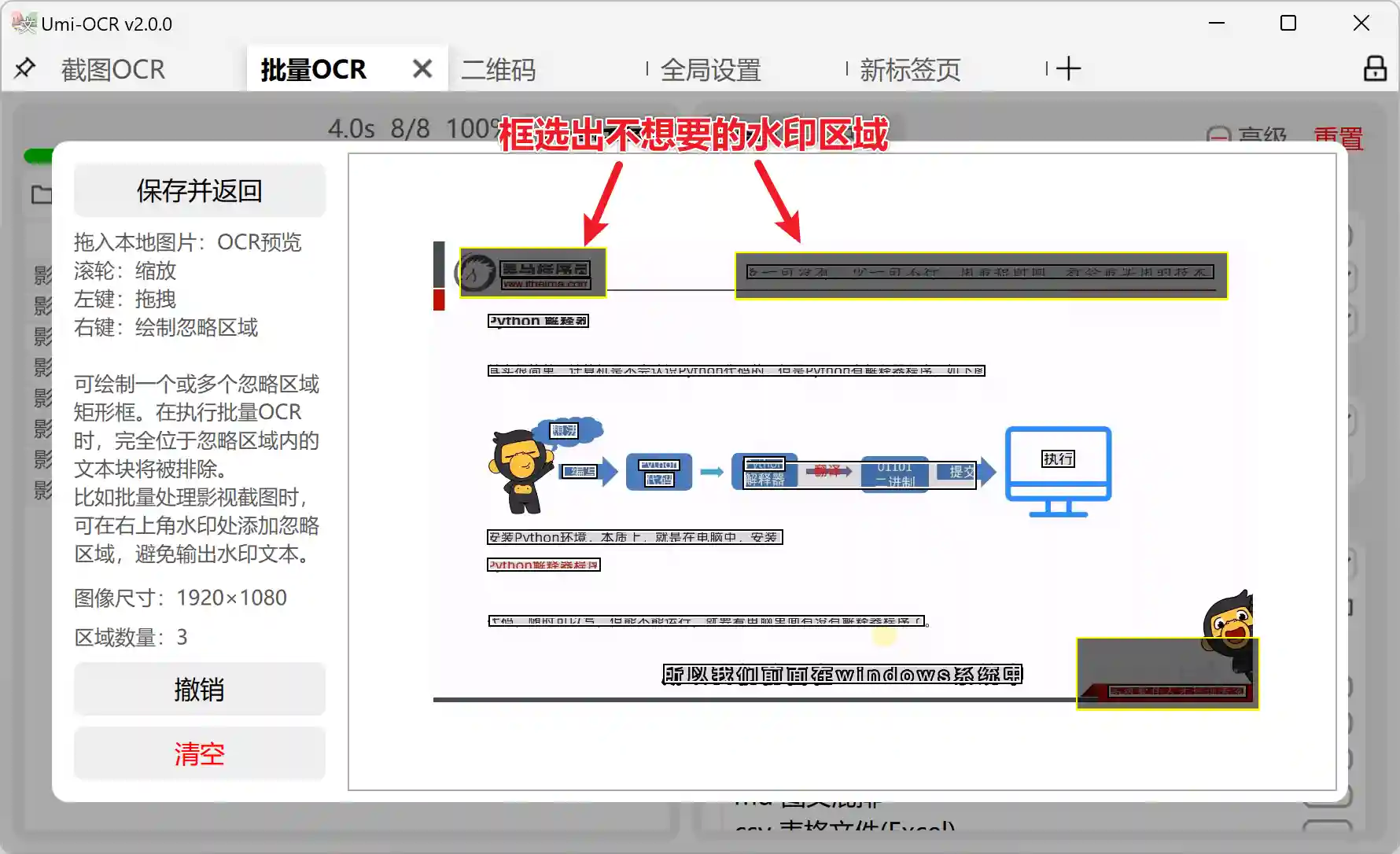 支持截图OCR、批量识别、二维码识别生成,提供忽略区域、排版优化等高级功能