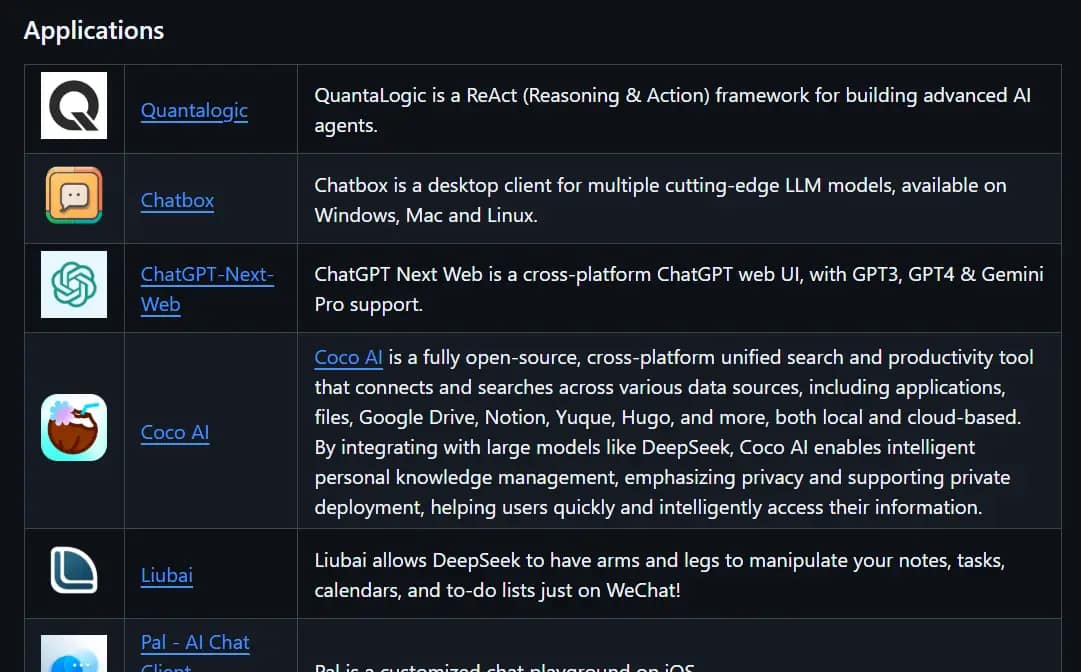 应用程序: 收录多款集成 DeepSeek API 的应用程序,覆盖桌面和移动平台。