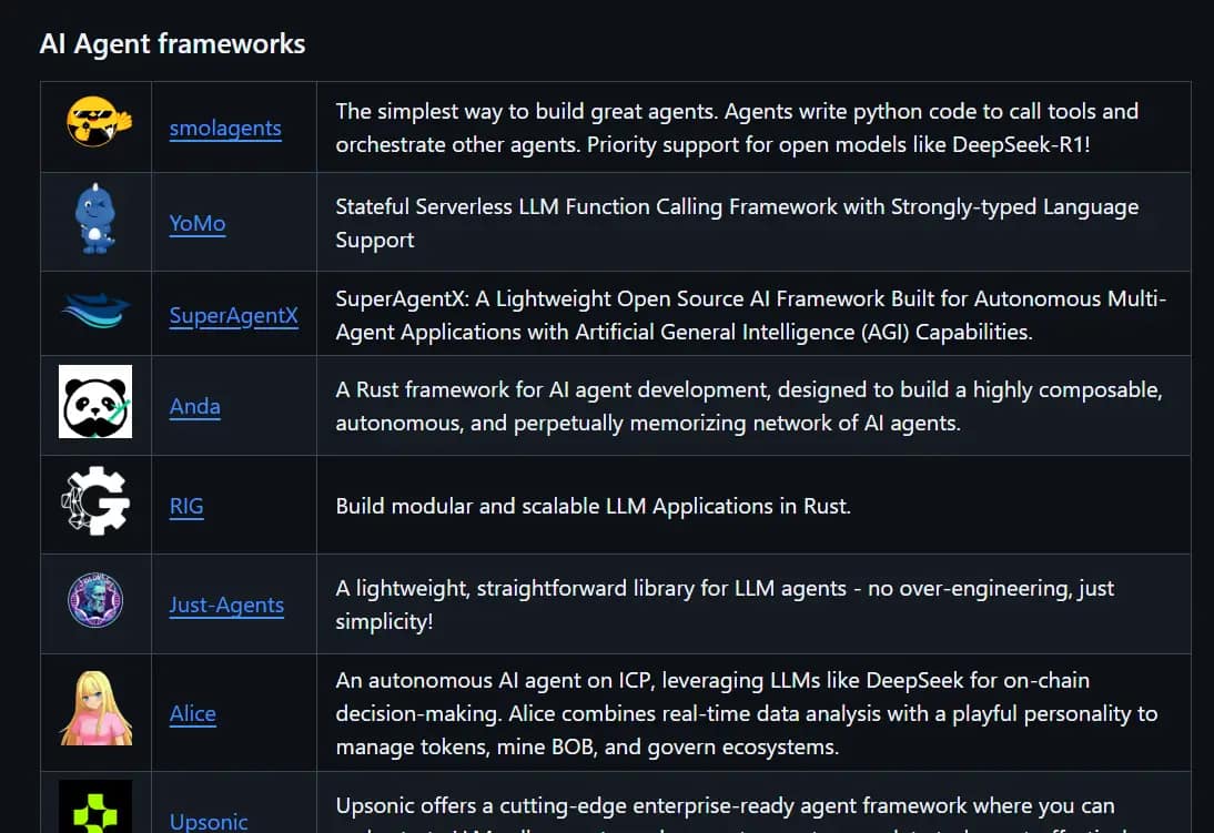 AI Agent 框架: 提供多个 AI 智能体开发框架,助力开发者构建自主决策和响应机制的虚拟助手。