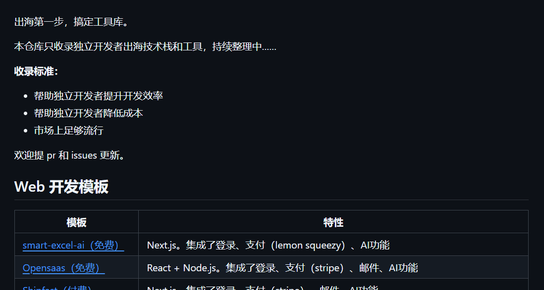 💼indie-hacker-tools 是一个为独立开发者提供的全面资源库,旨在帮助开发者们在出海过程中选择合适的技术栈和工具。这个项目比之前的项目更详细和全面,通过它,开发者们可以更好地了解和使用各种技术,从而提升开发效率和产品质量。