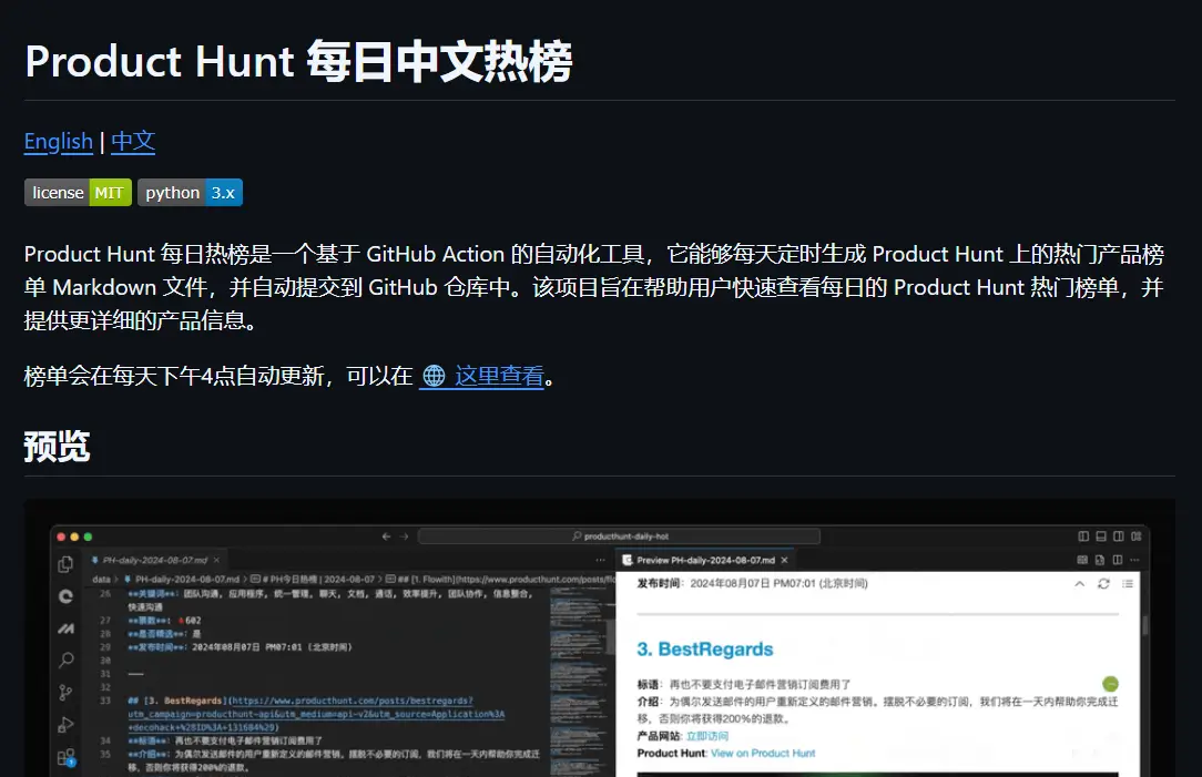 🔥 Product Hunt Daily Hot 是一个自动化工具,它通过 GitHub Actions 每天自动抓取 Product Hunt 上的热门产品,并生成中文榜单。这个项目为中文用户带来了极大的便利,让关注全球创新动态变得触手可及。